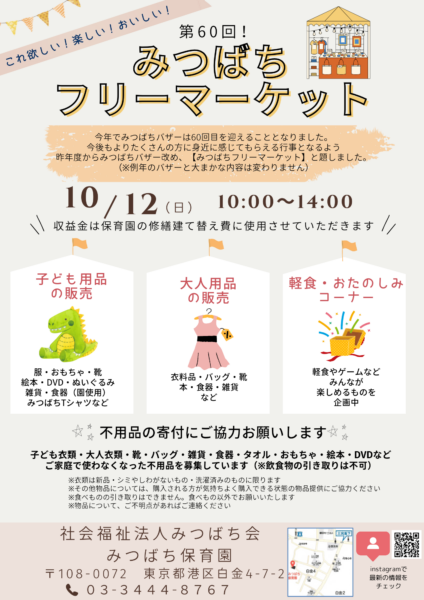 お知らせ HOME お知らせ一覧 みつばちフリーマーケット開催!! みつばちフリーマーケット開催!! 2025.09.25 バザー 今年もみつばちフリーマーケット(バザー)を 10月12日(日)10:00~14:00で開催します。 物品の募集もしています。詳しくはチラシをご覧ください。
